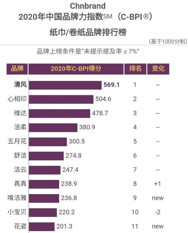 清風(fēng)能夠連續(xù)兩年榮獲“2020年C-BPI中國品牌榜紙巾/卷紙類第一品牌*”,同公司品牌真真和唯潔雅也成功躋身前十,這不僅證明產(chǎn)品品質(zhì)得到認(rèn)可,更意味著品牌獲得廣大消費者的喜愛與支持。