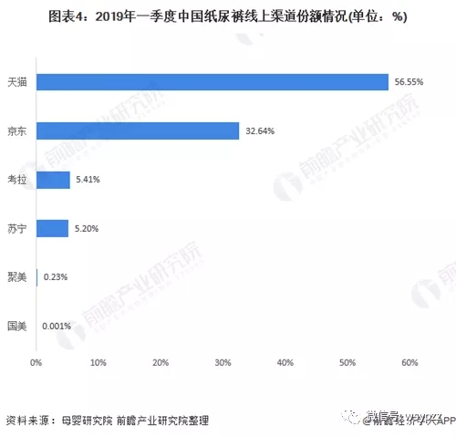 可見,線上渠道是紙尿褲銷售的重要渠道。2019年第一季度,紙尿褲銷售額達48.1億元,同比增長12.6%。其中天貓平臺保持其“一哥”優(yōu)勢,銷售額27.2億元,占比56.5%。京東平臺銷售額15.7億元,占比32.6%,同比增長6.1%。在增長率上,考拉出現(xiàn)了20.2%的負增長,蘇寧實現(xiàn)了214.8%的超高速增長。.jpg)