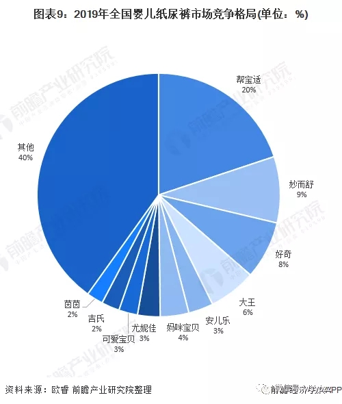 2019年全國嬰兒紙尿褲市場中,幫寶適以20%的市場份額遠超其他品牌。排名前十的品牌市場份額為60%,品牌眾多,市場競爭相對激烈。