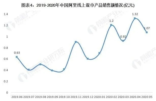 2020年疫情呈現(xiàn)爆發(fā)極大地刺激了濕巾的消費需求,2020年1-5月,阿里濕巾線上銷售額均在1億元左右,2020年4月銷售額更是高達(dá)1.32億元,2020年2月環(huán)比增速達(dá)到113.63%。