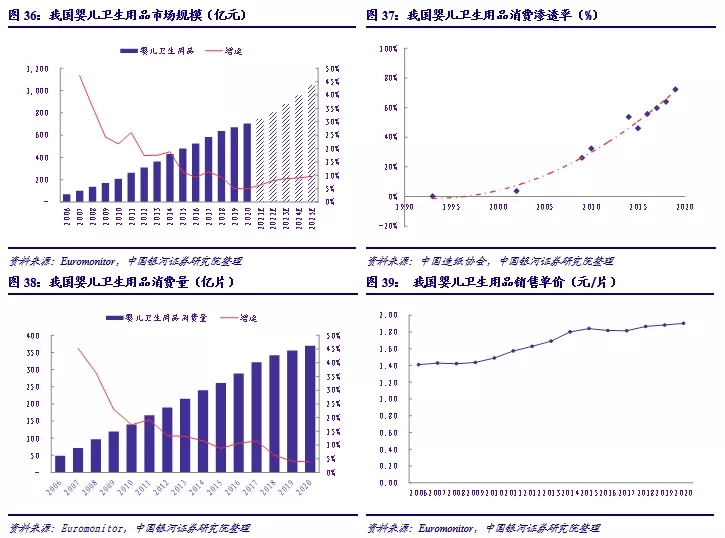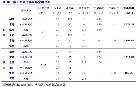 考慮到滲透率、日均使用量以及產(chǎn)品價格帶多種因素的差異,我們同樣按照不同地區(qū)劃分對嬰兒衛(wèi)生用品市場規(guī)模進行了預(yù)測。其中因為0-3歲區(qū)間內(nèi)不同年齡段嬰兒的日均更換頻次不同,預(yù)測中進行了取均數(shù)處理,通常新生兒每日應(yīng)該更換6-8次,隨著年齡的增長時間間隔可以逐步拉長。綜上,我們樂觀預(yù)期我國嬰兒衛(wèi)生用品的終端市場規(guī)模約2100億元,保守也可達到1100億元,較20年市場規(guī)模有60%-200%的提升空間;出廠價按照樂觀1.50元/片、保守1.20元/片的行情預(yù)測,出廠市場規(guī)模也可達到490-1000億元。