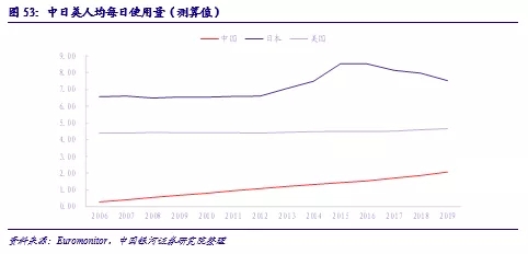 3.人均使用量的提升。伴隨著衛(wèi)生意識的提高,消費升級趨勢以及嬰兒衛(wèi)生用品新產(chǎn)品的更新?lián)Q代,家長們會更加注重紙尿褲安全性與舒適感,不斷提高使用更換頻次。根據(jù)測算,日本市場出現(xiàn)波動前每個適齡嬰幼兒(0-3歲)的每日使用量約為6.5片,美國市場的長期均值水平為4.5片/日;對比之下,盡管出現(xiàn)提升趨勢,我國當(dāng)前的人均使用量為2片/日,較發(fā)達成熟市場存在較大差距,未來有望進一步提升至4-6片/日的區(qū)間內(nèi)。