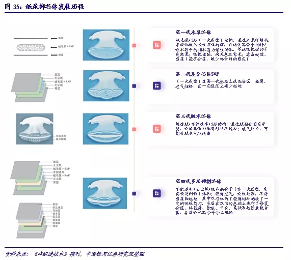 自香港的瑞德國際旗下品牌Fitti菲比(1992年),以及金佰利旗下品牌好奇(1994年)進入中國大陸市場,我國嬰兒衛(wèi)生用品行業(yè)經(jīng)歷了快速發(fā)展,產(chǎn)品在材質(zhì)、結(jié)構(gòu)等層面不斷迭代更新。行業(yè)整體與其核心——芯體的發(fā)展歷程相近,以2006年為階段性節(jié)點,在此之前,我國的嬰兒衛(wèi)生用品行業(yè)以外資品牌為主,好奇、幫寶適、媽咪寶貝等國際品牌集中進入中國市場,產(chǎn)品芯體雖有結(jié)構(gòu)分區(qū)的變化,但以絨毛漿和SAP材質(zhì)為主導(dǎo);2006年不含絨毛漿的復(fù)合芯體結(jié)構(gòu)出現(xiàn),此后國內(nèi)品牌大舉擴張,市場內(nèi)多品牌混戰(zhàn)。