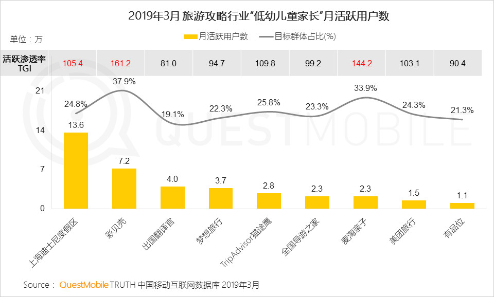 在親子旅游方面,隨著親子節(jié)目的熱播,讓近兩年親子游市場(chǎng)持續(xù)火爆。在旅游攻略APP中,彩貝殼目標(biāo)群體占比37.9%,其次為麥淘親子33.9%,而麥淘親子、上海迪士尼、彩貝殼等親子游類(lèi)的旅游攻略受到低幼家長(zhǎng)的青睞。從中可以看到隨著對(duì)教育要求的全面升級(jí),孩子的眼界和經(jīng)歷、親子陪伴也成為了父母關(guān)注的一大重點(diǎn)。