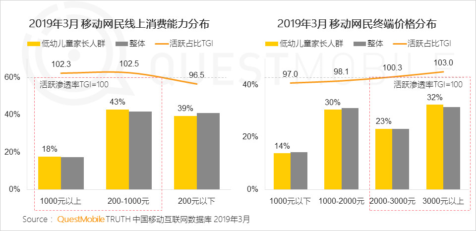 2019年3月移動(dòng)網(wǎng)民線(xiàn)上消費(fèi)能力數(shù)據(jù)顯示,200-1000元線(xiàn)上消費(fèi)占比43%,1000元以上18%,200元以下39%。但網(wǎng)民終端價(jià)格3000元以上占32%,2000-3000元占23%。從中可以看到“低幼兒童家長(zhǎng)”人群線(xiàn)上消費(fèi)能力顯著高于整體網(wǎng)民,且使用高價(jià)格終端的比例較高,未來(lái)兒童消費(fèi)將成為經(jīng)濟(jì)市場(chǎng)一大增長(zhǎng)點(diǎn)。