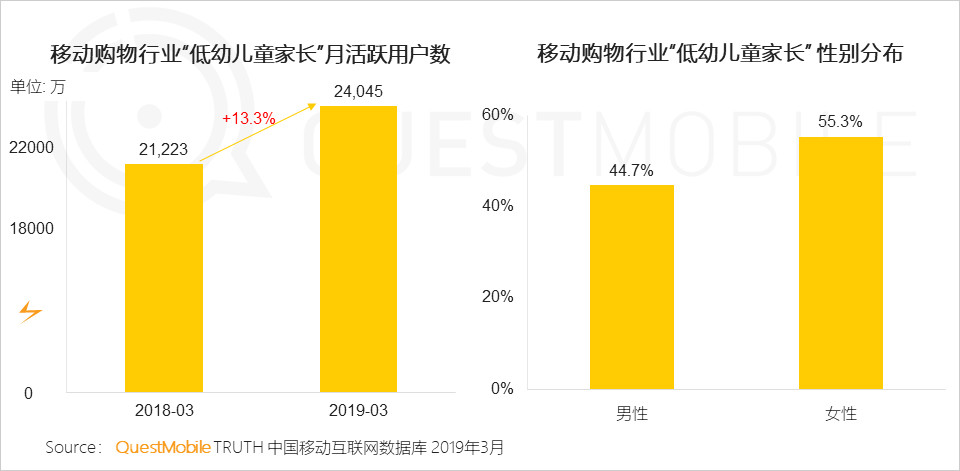 在線(xiàn)消費(fèi)領(lǐng)域,2019年3月網(wǎng)購(gòu)的“低幼兒童家長(zhǎng)”人群同比增長(zhǎng)13.3%;其中移動(dòng)購(gòu)物行業(yè)”低幼兒童家長(zhǎng)“性別分布上來(lái)看,男性占44.7%,女性占到55.3%??梢?jiàn)得“寶媽”者得市場(chǎng),女性的占比顯著高于男性。