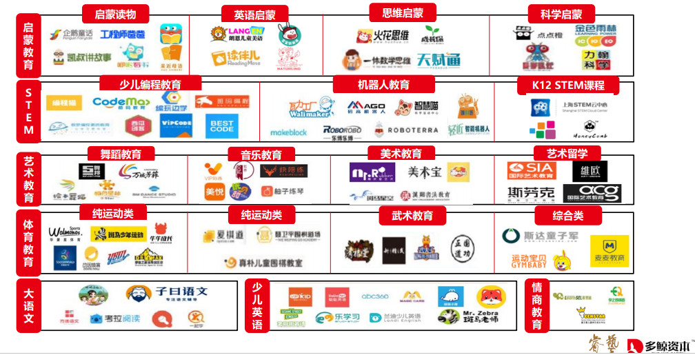 從素質(zhì)教育細(xì)分賽道典型公司來(lái)看,產(chǎn)品類(lèi)型覆蓋啟蒙教育、藝術(shù)教育、早幼教平臺(tái)、少兒編程教育、情商教育等。