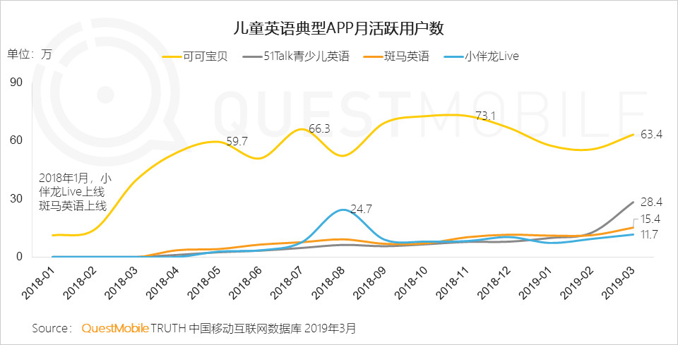 在兒童英語(yǔ)典型APP月活躍用戶(hù)數(shù)來(lái)看,小伴龍活躍用戶(hù)數(shù)最高為63.4萬(wàn),其次為51Talk青少兒英語(yǔ)。